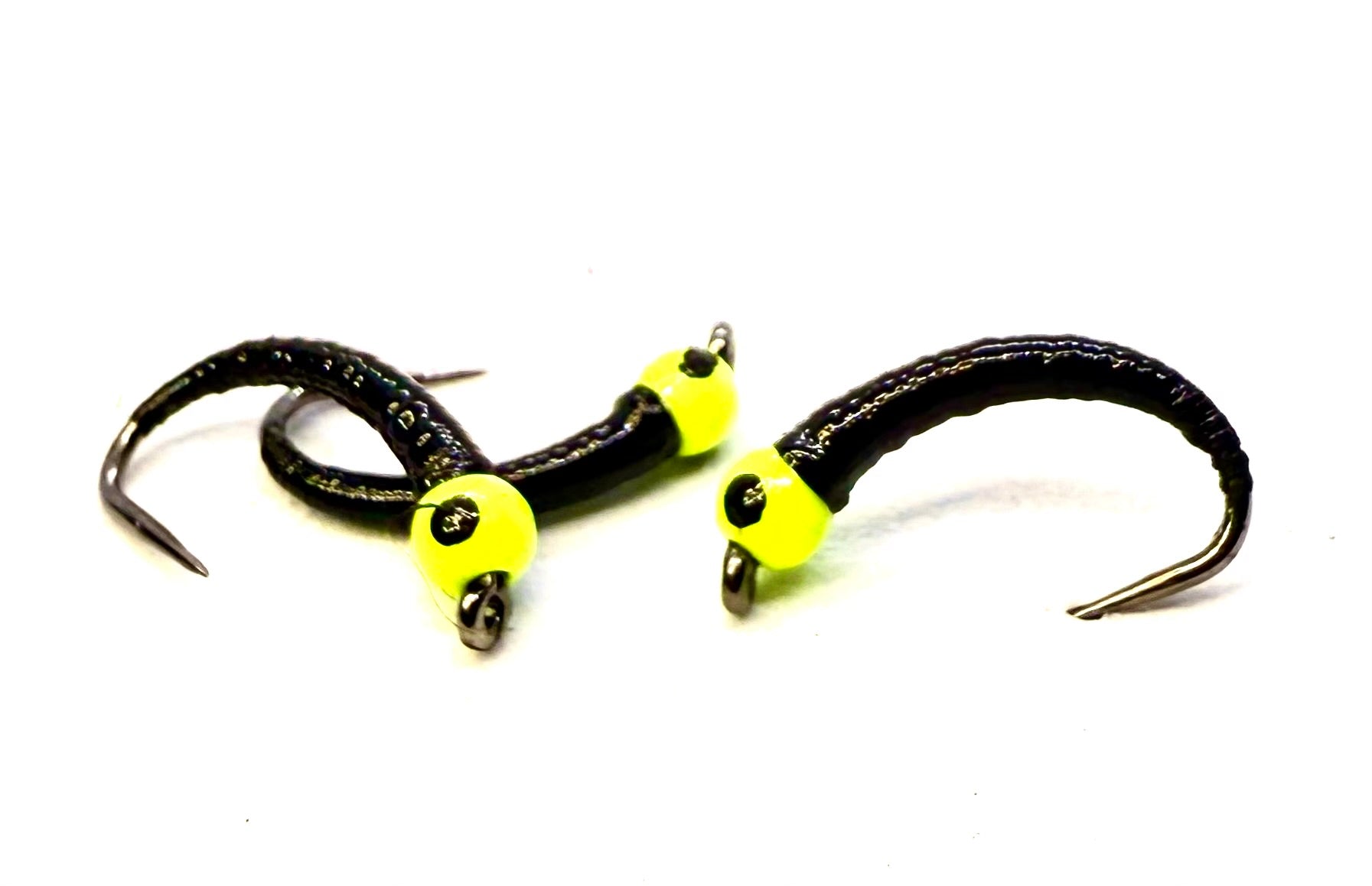The Dogs Bollocks is a buzzer-style nymph tied with a black body and finished with a bright yellow head for a strong visual trigger. Its slim, lifelike profile makes it ideal for enticing trout on small waters and stocked venues, particularly when fish are feeding just below the surface. This pattern works perfectly under a bung or indicator, or can be fished on its own on a floating line, allowing it to be versatile across a range of presentations. The contrast between the dark body and bright head helps provoke takes from both opportunistic and selective fish.