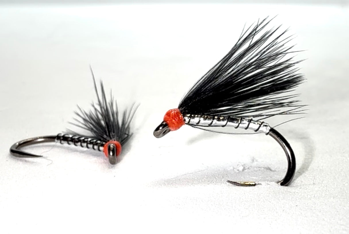 The Hot Head Silver Cormorant is a classic Cormorant-style fly designed to imitate tiny fry and emerging prey. Its silver body reflects light underwater, mimicking the flash of pin fry, while the red “hot head” provides a bold focal point that attracts the attention of trout. The soft black marabou wing adds lifelike pulsation, creating natural movement in the water.