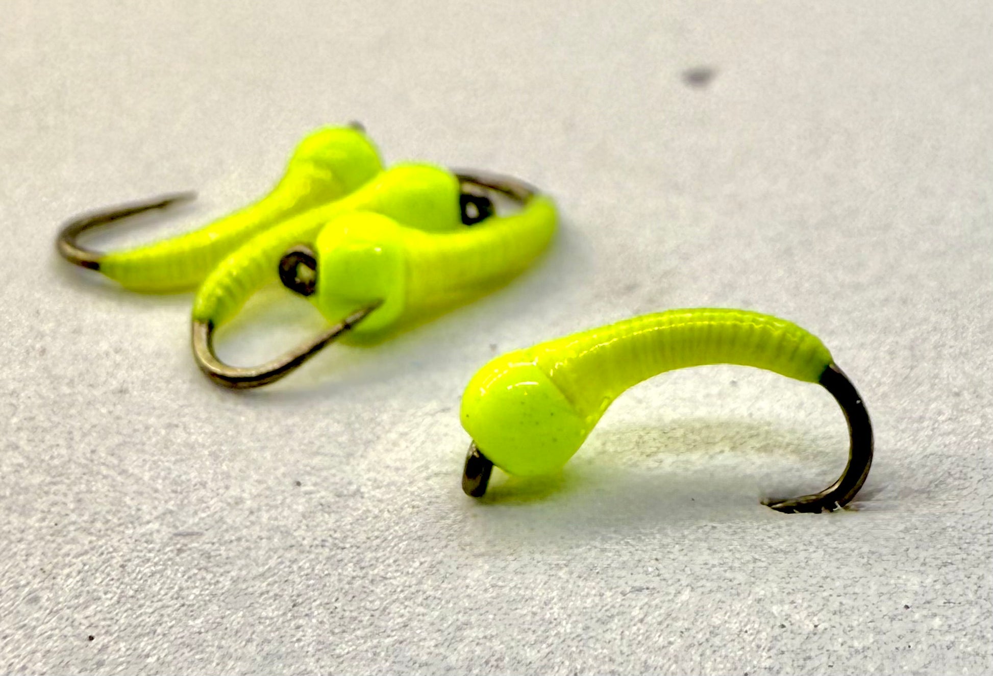 The Yellow Dogs Bollocks is a buzzer-style nymph tied with a bright yellow body and head, providing a strong visual trigger for trout. Its slim, lifelike profile makes it highly effective on small waters and stocked venues, particularly when fish are feeding just below the surface. Perfect for fishing under a bung or as a single fly on a floating line, the Yellow Dogs Bollocks provokes confident strikes from both opportunistic and selective trout. Its bold colour and simple design make it a versatile and reliable choice for any angler targeting subsurface feeders.
